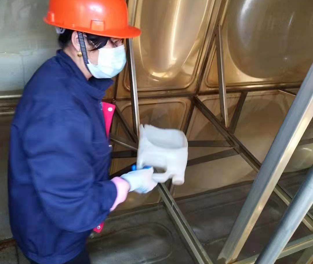 在清洗水箱的過程中,消毒人員須帶護眼鏡、口罩,如在水箱內感到
